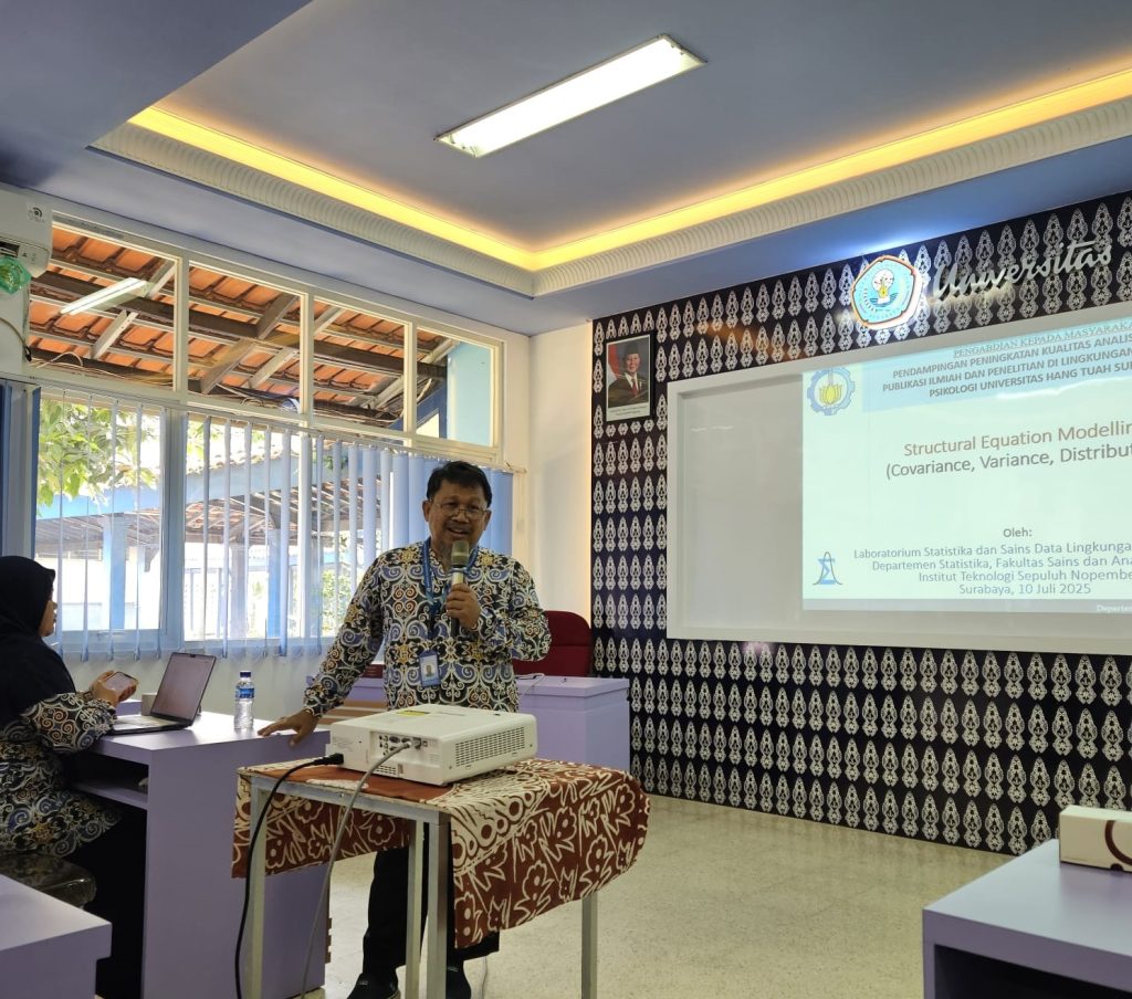 Surabaya, 10 Juli 2025 – Telah terlaksana workshop di Fakultas Psikologi Universitas Hang Tuah (UHT) yang bertajuk “Pendampingan Peningkatan Kualitas Analisis Data dalam Publikasi Ilmiah dan Penelitian” pada Kamis, 10 Juli 2025. Kegiatan kolaboratif ini menghadirkan tim ahli dari Laboratorium Statistika dan Sains Data Lingkungan dan Kesehatan ITS yang terdiri dari 6 dosen dan 6 mahasiswa, dengan narasumber utama Prof. Dr. Bambang Widjanarko Otok, M.Si, pakar statistika ternama Indonesia.